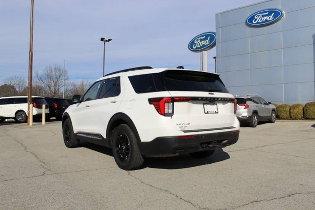 White Metallic 2025 Ford Explorer Active RWD 10-Speed Automatic 2.3L EcoBoost I-4 4-Wheel Disc Brakes, 6 Speakers, ABS brakes, Air Conditioning, AM/FM radio: SiriusXM with 360L, AM/FM Stereo, Automatic temperature control, Dual front impact airbags, Dual front side impact airbags, Emergency communication system: 911 Assist, Equipment Group 200A Standard Package, Four wheel independent suspension, Front anti-roll bar, Front dual zone A/C, Knee airbag, Low tire pressure warning, Navigation System, Occupant sensing airbag, Overhead airbag, Power driver seat, Power steering, Power windows, Rear air conditioning, Rear anti-roll bar, Rear window defroster, Remote keyless entry, Speed-sensing steering, Steering wheel mounted audio controls, Traction control.